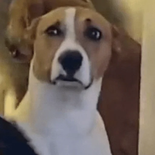 Cachorro com olhos arregalados e expressão surpresa, sentado em frente a um sofá laranja.