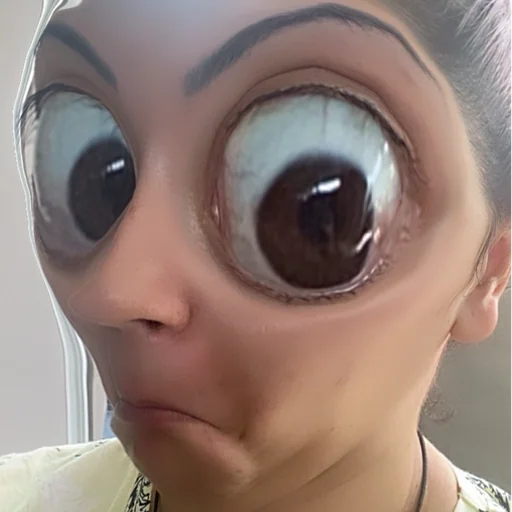 Menina com olhos muito grandes e arregalados, parecendo surpresa ou assustada.