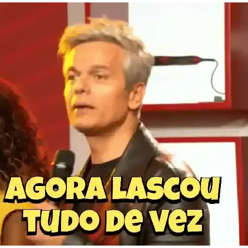 Blond man with a microphone, serious expression, red and yellow background. Text: 'AGORA LASCOU TUDO DE VEZ'
