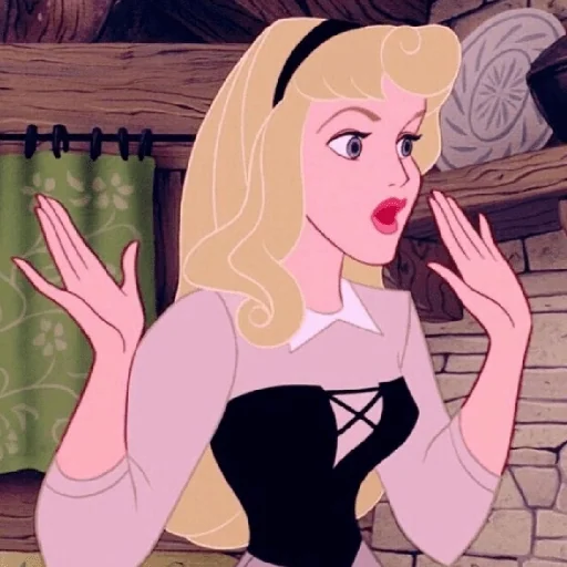 Princesa Aurora, de A Bela Adormecida, com expressão curiosa e vestida com um traje rosa e preto.