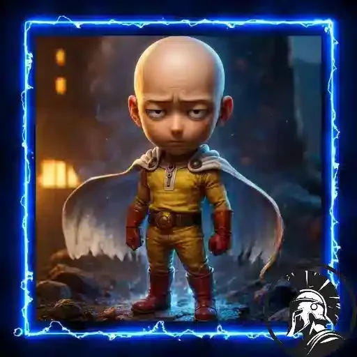 Bald anime character in yellow suit and cape, serious expression, dark background with lights.