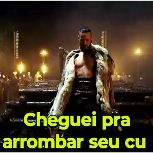 A man wearing a light fur coat stands in a nighttime scene with yellow lights in the background. He appears muscular and has a serious look. The image includes the text 'Cheguei pra arrombar seu cu' in yellow letters.