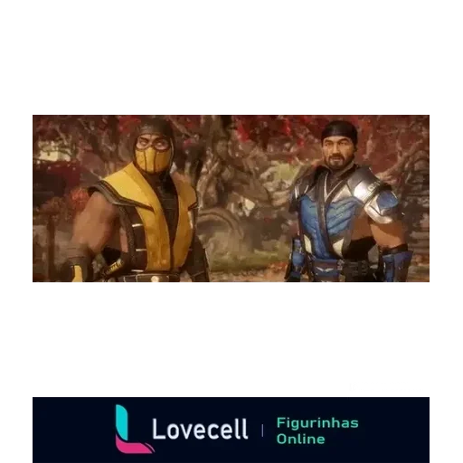 Um personagem de Mortal Kombat com uma máscara, cabelo preto preso e armadura, empunhando uma espada em chamas com a…