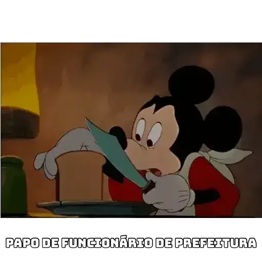 Mickey Mouse with a surprised or scared expression, wearing a red shirt and white bow tie, looking at a green paper. The text 'PAPO DE FUNCIONÁRIO DE PREFEITURA' is written below the image.