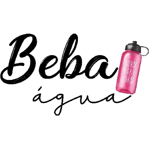 An illustration with the phrase 'Beba água' in black cursive letters, accompanied by a pink water bottle.