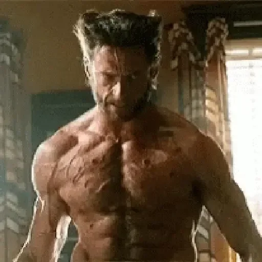 Muscular shirtless man with black hair and a serious look, in a room with curtains and a window in the background.