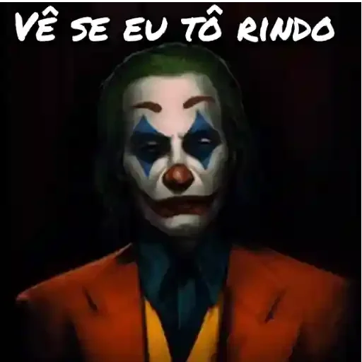 The Joker with white and blue makeup, wearing an orange and yellow suit, with the text 'VÊ SE EU TÔ RINDO' on top.