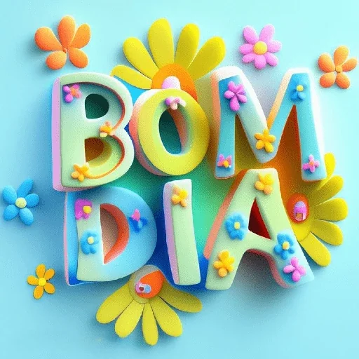 A colorful sticker with the phrase 'BOM DIA' in large, decorated letters, on a light blue background with yellow, orange, pink, and blue flowers.