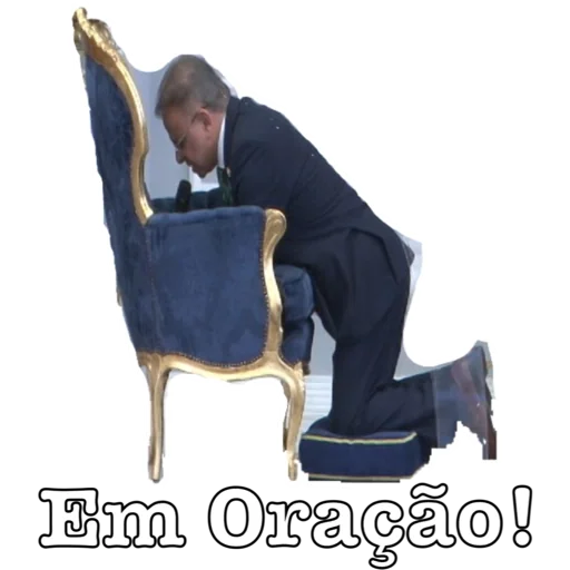 A man in a suit, kneeling on a blue armchair with gold details, with his head down. The image features the text 'Em Oração!'