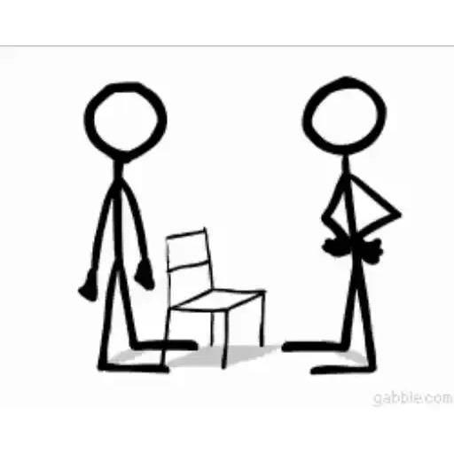 Two stick figures talking, one sitting on a chair and the other standing with hands on hips.