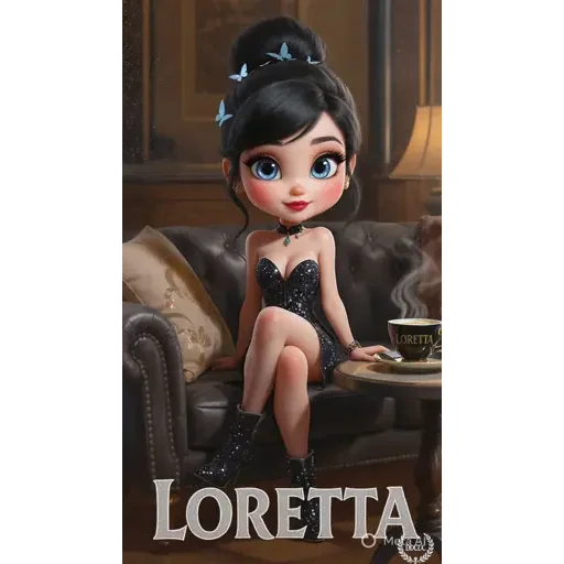 A blue-eyed girl with black hair sitting on a sofa wearing a black dress. She has a cup in her hand and there's a text 'LORETTA' below her.