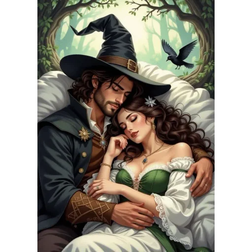 A couple embracing in a forest, the man wearing a wizard hat and the woman in a green and white dress, both with serene expressions.