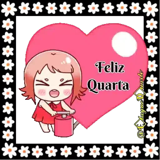 Um desenho colorido com a frase 'Feliz quarta!' em letras grandes e decoradas, acompanhada de flores rosadas e corações.