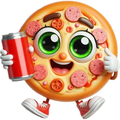 An animated pizza slice with large green eyes and a smile, wearing red shoes and holding a red can.