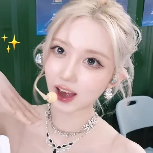 Mulher jovem com cabelo platinado e brincos longos, vestindo uma blusa preta, com expressão neutra.