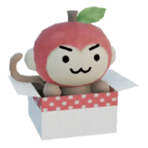 A monkey with an apple-shaped head, green leaves, peeks out of a white box with red and white details. The monkey has black eyes and an angry facial expression.
