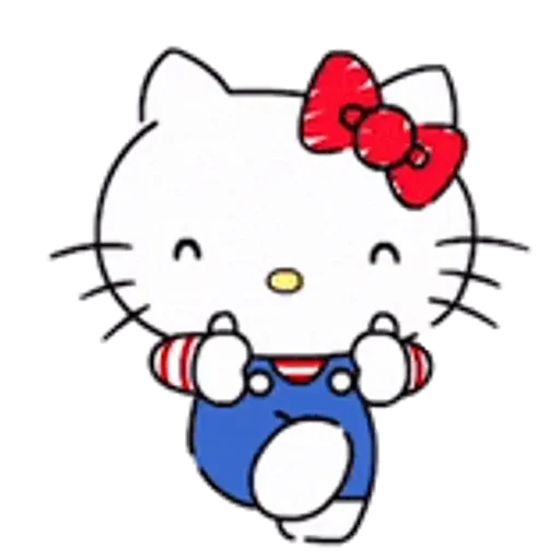 Hello Kitty wearing blue overalls and a red bow in her hair