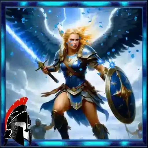 A woman with wings and blonde hair, dressed in blue and silver armor, holds a sword and a shield. She stands amidst a scene with lightning and clouds.