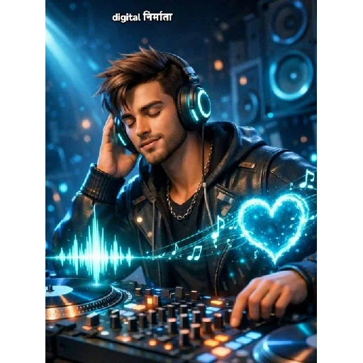 A man wearing headphones and a black jacket operates a DJ setup, with a blue glowing heart and a heart rate graph in front. The background features blue lights and sound equipment.