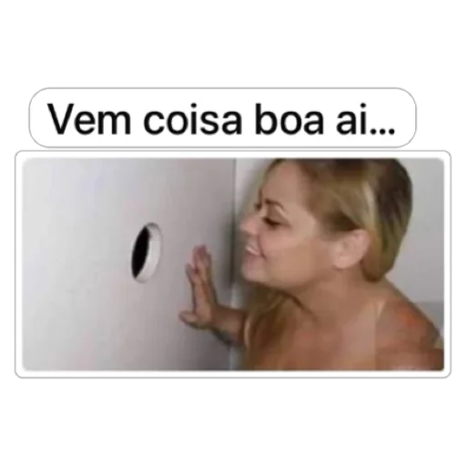 A blonde woman with her hand on a wall, looking through a hole, with the caption 'Vem coisa boa ai...'