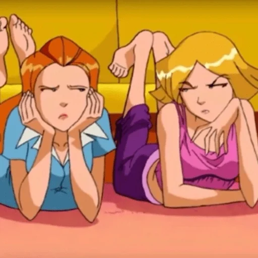 Two women lying on their stomachs, with their hands on their faces and a look of discouragement or concern. The woman on the left has red hair and wears a blue top, while the woman on the right has blonde hair and wears a pink tank top.