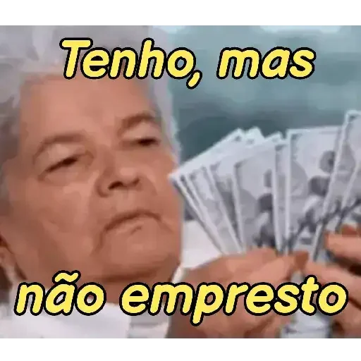 An elderly man with a serious expression, holding money, with the text 'Tenho, mas não empresto' overlaid.