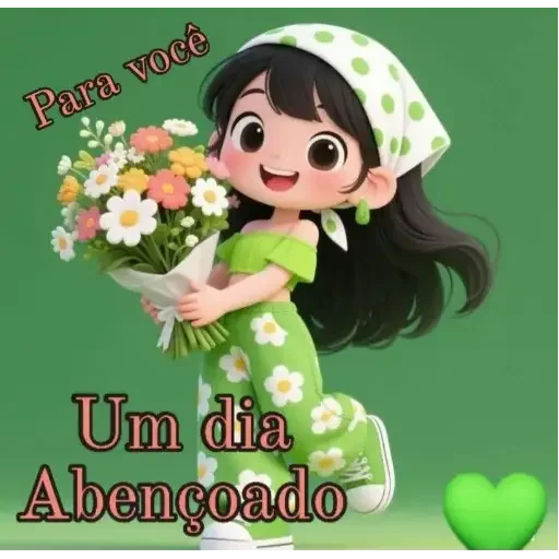 A girl with long black hair and a green and white hat holding a bouquet of flowers, with the text 'Para você Um dia Abengoad'.