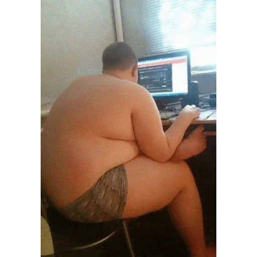 A shirtless man wearing underwear, sitting with his back to the viewer, in front of a computer.