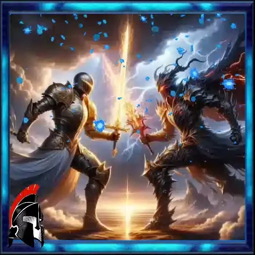 Two fantasy warriors face each other, wearing armor and holding weapons, amidst a dramatic scene with lights and magical effects.