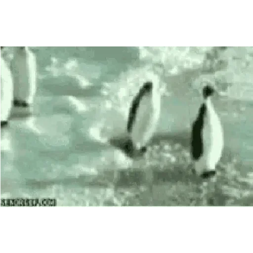Three penguins standing in water with waves around them, black and white image with a green tone.
