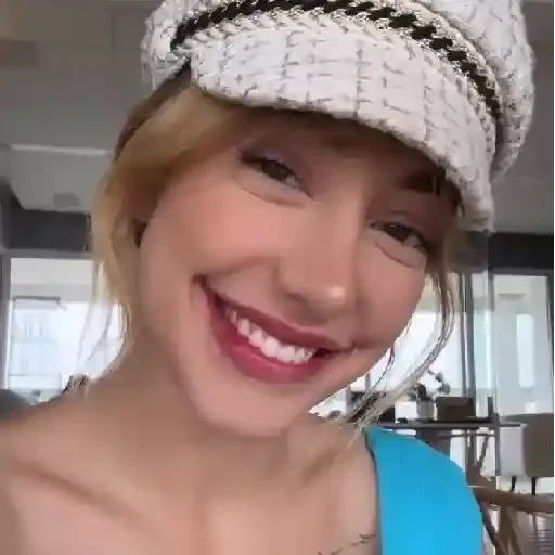 A young woman wearing a white hat and a wide smile, in a blue dress. She looks happy and cheerful.