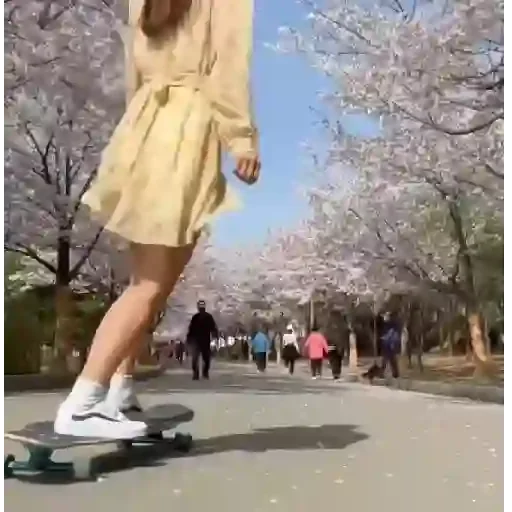 Girl in beige dress and white sneakers is skateboarding on a street with white and pink blooming trees in the background and people walking in the distance.