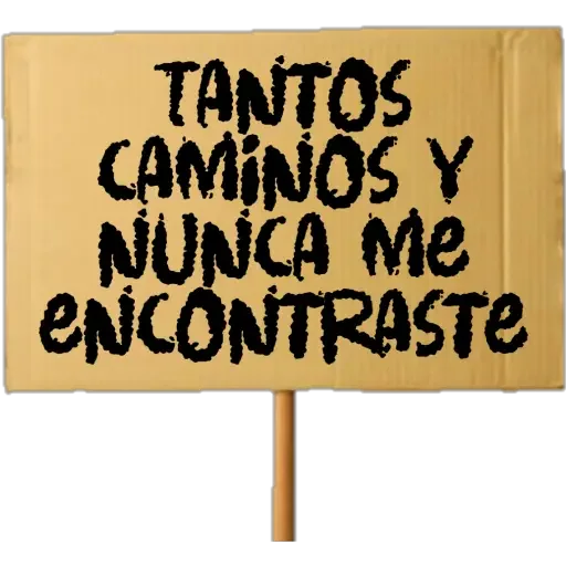 Cardboard sign with text 'Tantos caminos y nunca me encontre'.