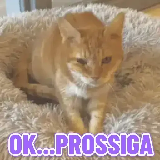 Orange cat lying on a fluffy bed with the phrase 'OK... PROSSIGA' in purple letters.