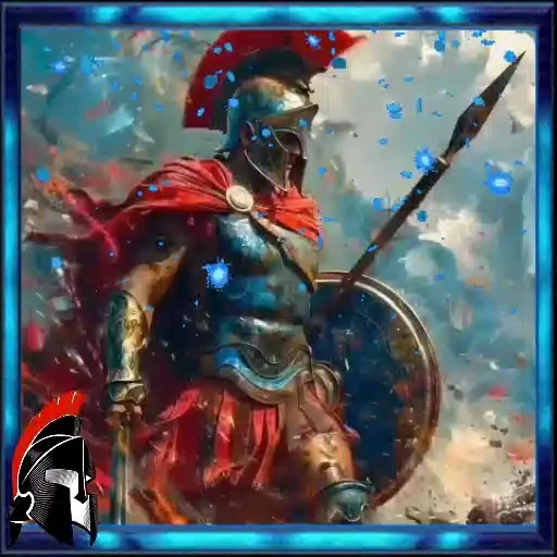 An ancient warrior in bronze armor, helmet and red cape, holding a shield and spear, with a blue and sparkling background.