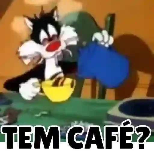 Taz with a surprised expression and raised arm holding a cup, with the phrase 'TEM CAFÉ?' prominently displayed.