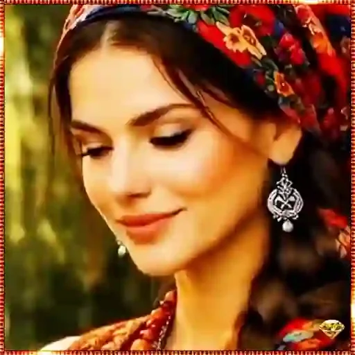 Uma mulher com cabelos castanhos e um lenço colorido na cabeça, vestindo uma roupa tradicional, sorri com os olhos…