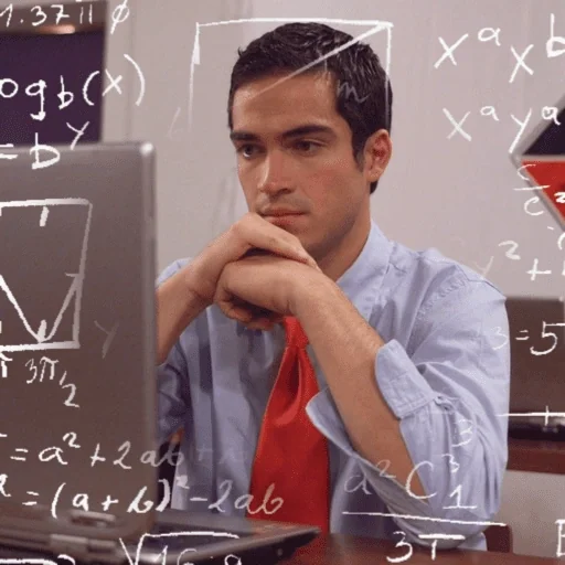 Man with a thoughtful expression in front of a computer, surrounded by mathematical equations.