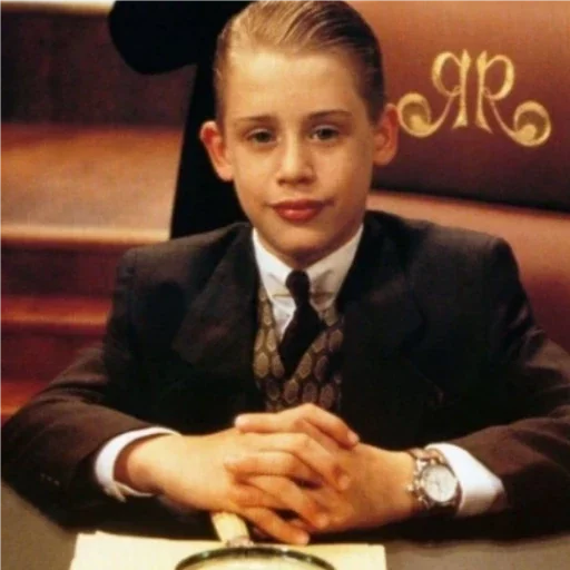 Blond boy in a black suit, checkered tie, and watch, with hands clasped on a table, against a dark background with gold initials.