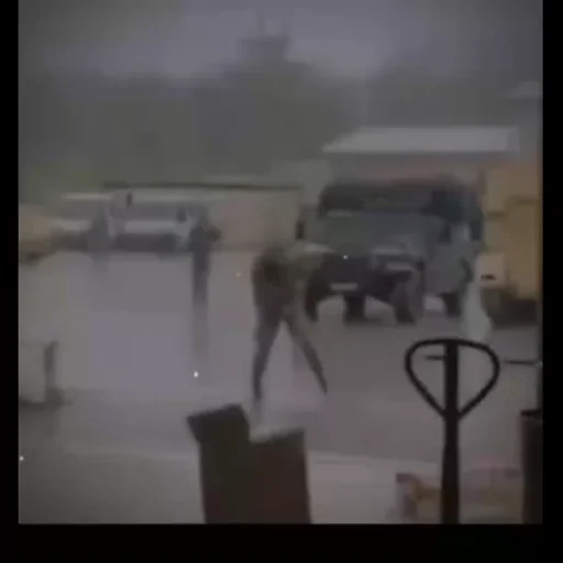 Scene of people in a parking lot during a storm, with vehicles and objects in the background.