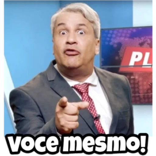 Um homem de meia-idade, com cabelo castanho e terno, apontando para algo com a frase 'TEM QUE VER ESSE NEGÓCIO Aí' ao…