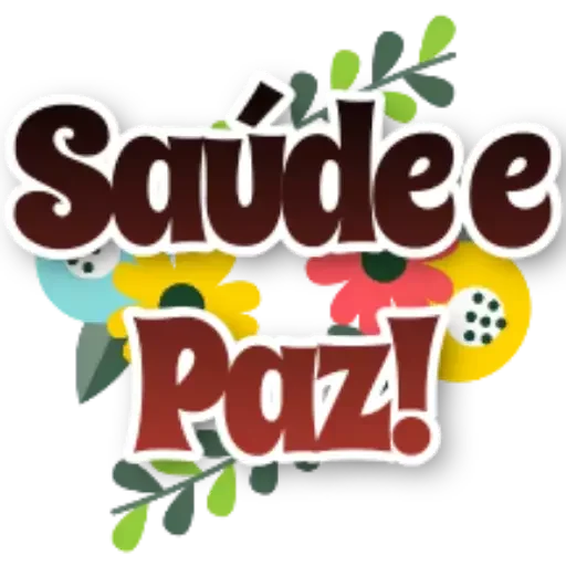 A colorful sticker with the text 'Saúde e Paz!' in large, brown and red letters, with flowers and leaves in the background.