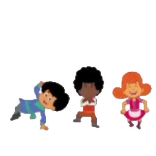 Three children of different ethnicities and skin tones dancing with joyful expressions. The boy on the left has black hair and is lying on his side, the middle boy has afro-textured hair, and the girl on the right has orange hair and is smiling.