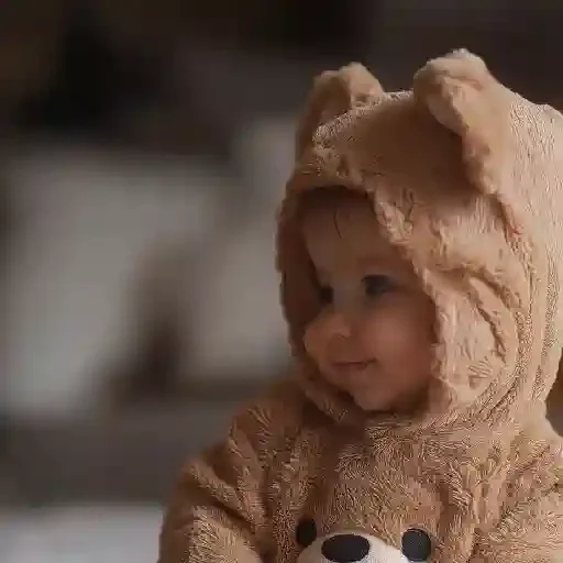 A baby wears a brown bear onesie with a hood, showing a soft and curious facial expression.