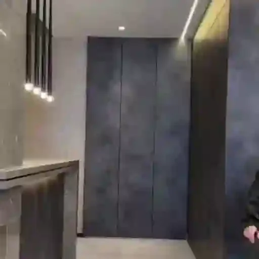 An image of a corridor or entrance hall with gray walls, light floor, and a wooden structure on the left. A person is partially visible on the right.