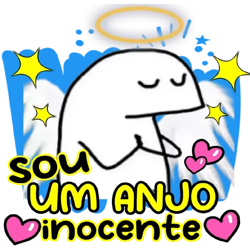 A drawing of a white angel with a golden halo, yellow stars, and pink hearts, with the phrase 'sou um anjo inocente' in colorful letters.
