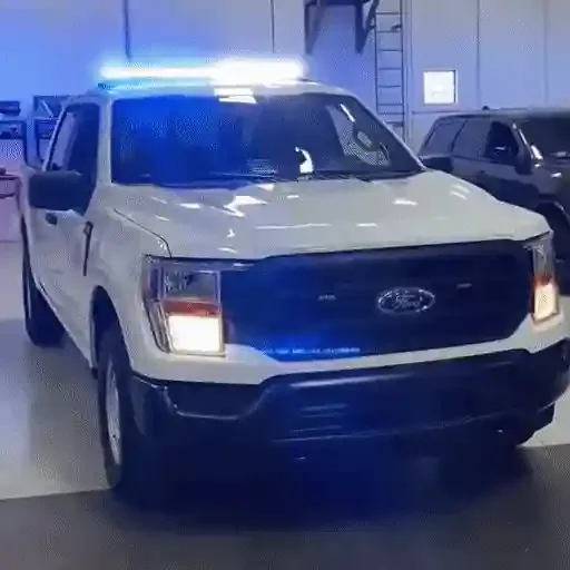 A white police car with flashing blue lights on top, in an indoor setting with another vehicle beside it.