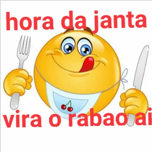 A smiling yellow emoji wearing a bib, holding a fork and knife, with the phrase 'hora da janta vira o rabão aí'.