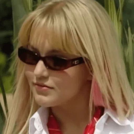 A blonde woman with bangs and sunglasses, wearing a white collared shirt with a red detail.