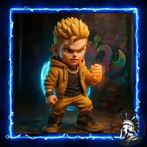Menino com cabelo roxo e boné preto fazendo uma pose dinâmica com glow azul, em um cenário urbano noturno.